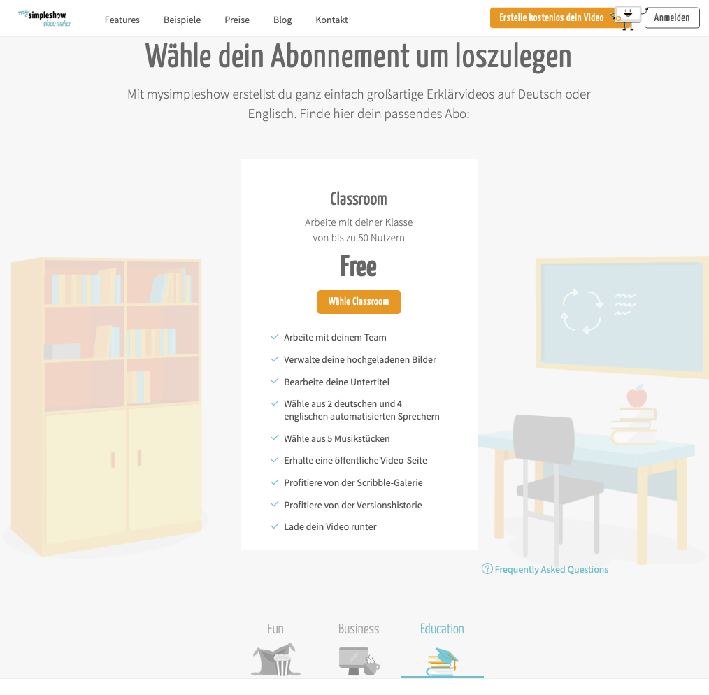 - Jetzt gut aufpassen: Scrolle etwas nach unten, dort findest du nach den vorgestellten Preisplänen den Link zum Bereich „Education“. Siehe dazu auch den Screenshot unten. Anschliessend kannst du eine Classroom-Lizenz beantragen.